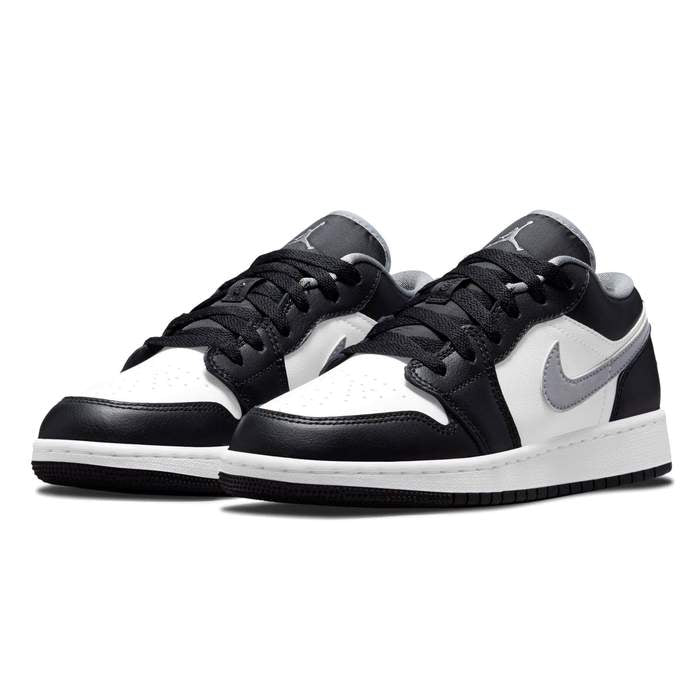 Dressed in smooth, black leather panelling across the toe cap, eyelets, ankle and heel, this is one clean Jordan 1 Low which is perfectly offset by a slate-grey Swoosh on both the medial and lateral sidewalls. The cushioned tongue is dressed in black to match the panelling, with grey piping around the top, whilst the actual lace unit ties up this J1 Low from toe to ankle in black. Michael Jordan's Jumpman logo sits atop the tongue in grey, matching to the stitched Wings insignia on the heel of the shoe. Finished up with a black, rubber outsole, this is the perfect sneaker to match any rotation and will suit any weather.
